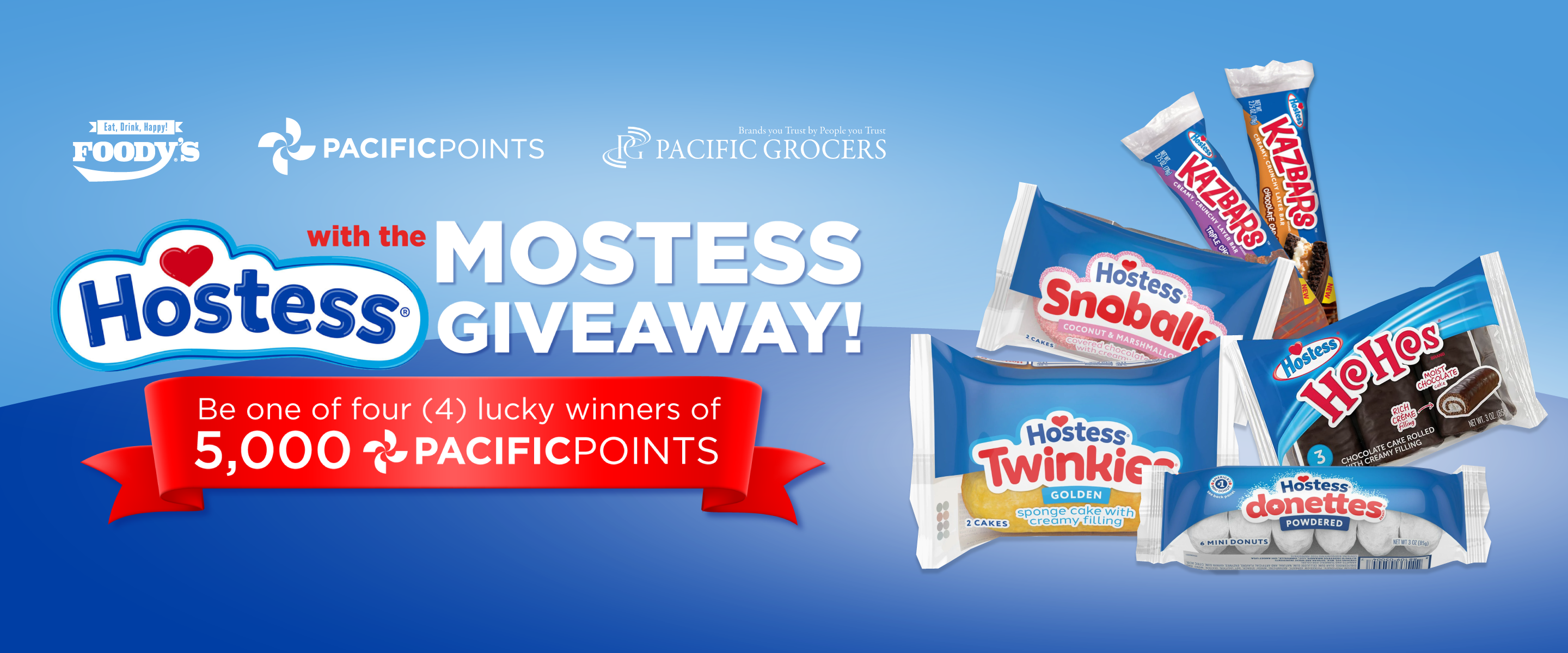 From now until March 8, 2026, treat yourself to your favorite Hostess products at Foody’s, scan your PACIFICPOINTS card with every purchase, and you’re automatically entered to WIN 5,000 BONUS PACIFICPOINTS!